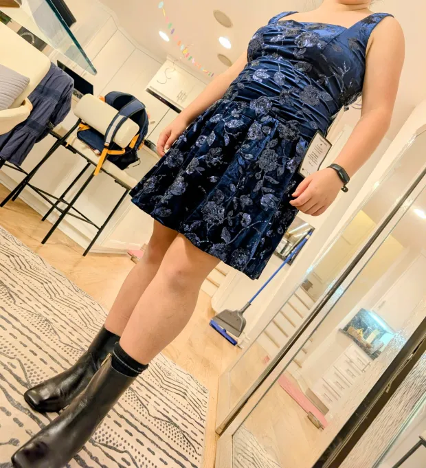 It’s all dark blue and velvet and sequins and glitter, at once as deep as the ocean and as clear as the night sky—just plain “Fantastic!” (That’s what the little fashion consultant friend texted when we looked lovingly at the dressing room photo at Macy’s.)
